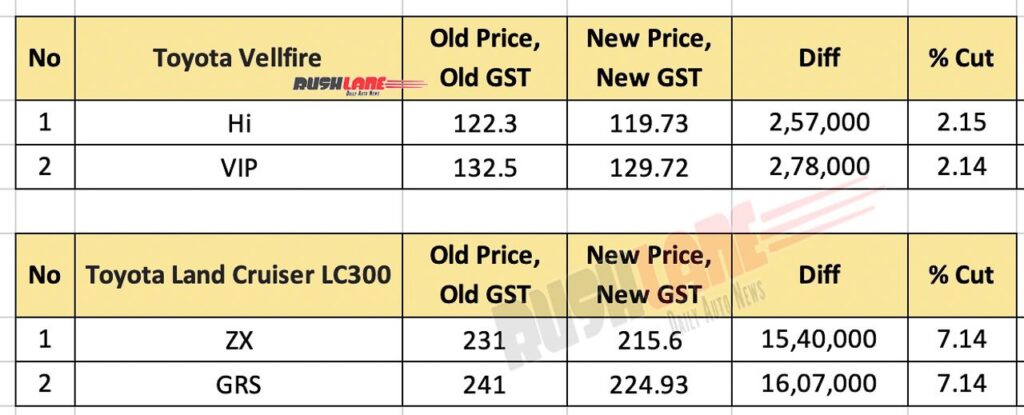Toyota has rolled out significant price reductions across its luxury and lifestyle vehicles, transferring the benefits of a lowered GST rate directly to buyers. Following earlier cuts on the Fortuner, Innova Crysta, Hycross, Glanza, Rumion, Taisor, and Hyryder, the company has now revised prices of the Hilux pickup, Camry sedan, Vellfire MPV, and flagship Land Cruiser LC300.